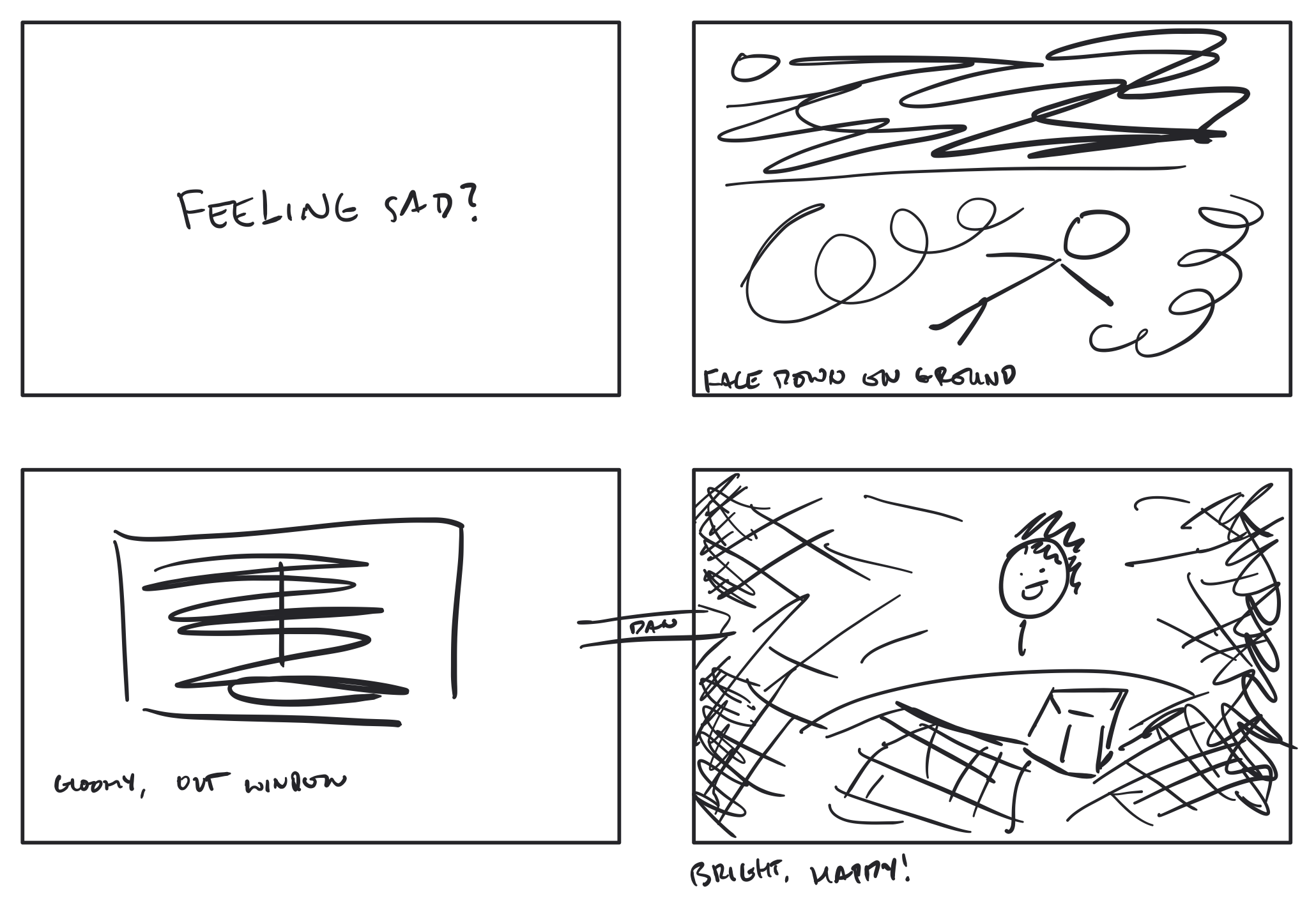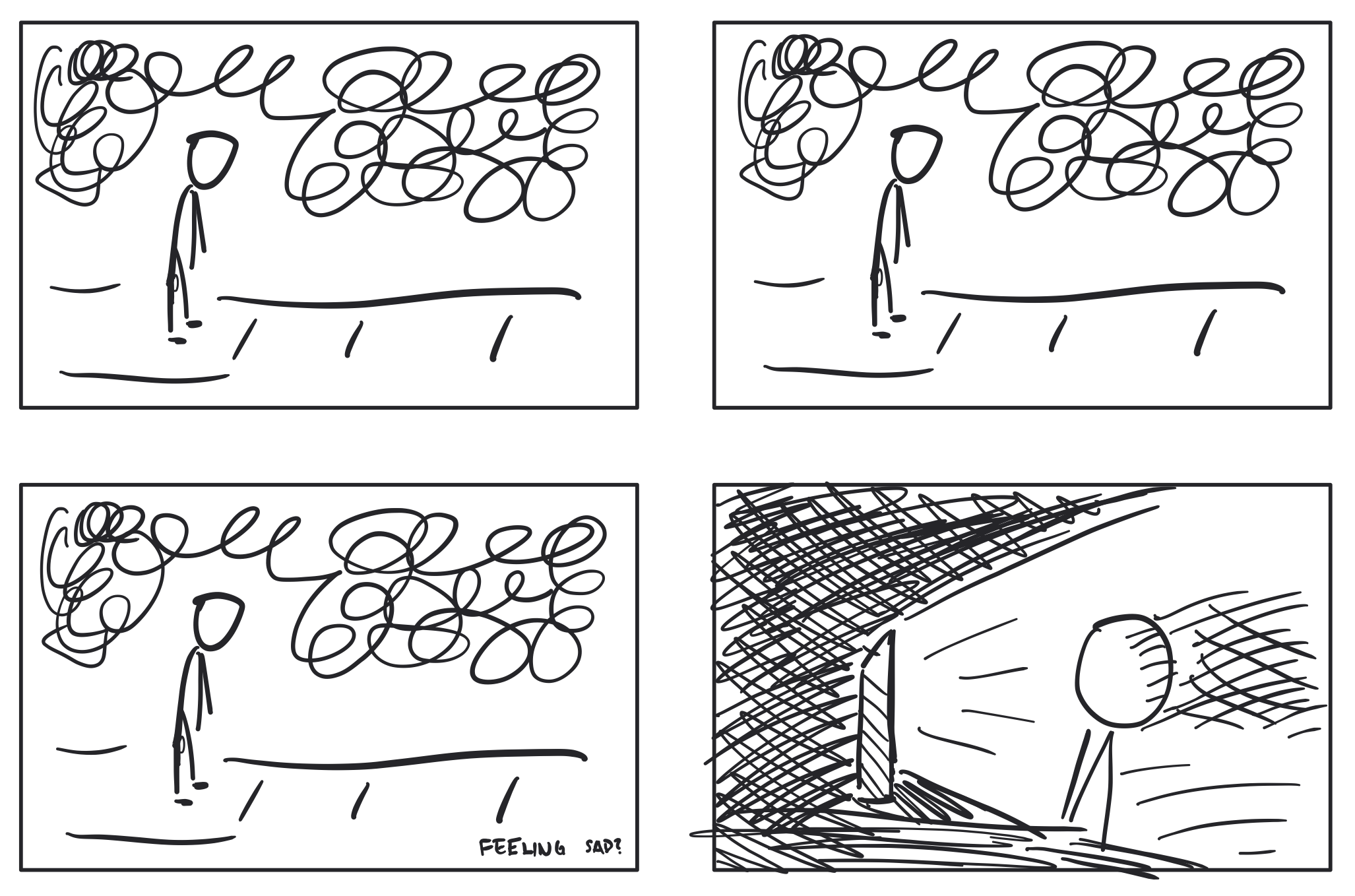 I initially created some sketches and storyboards to help me refine the vision for my video. I wanted my video be fairly simple. My first idea was to just show a person walking slowly outside on a gloomy day, for an almost awkwardly long time, to represent how SAD can make it difficult to stay motivated or have interest in doing things. Then, the person would turn on the therapy light and begin to feel better.